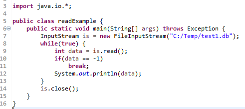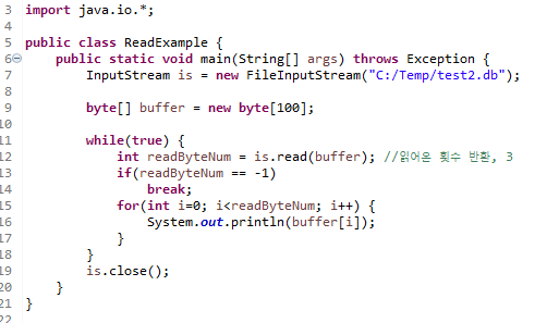 7번째 줄과 같이 new 생성자를 이용해 C:/Temp/test1.db와 연결된 FileInputStream 입력 스트림 객체를 만들어 준다. 10번째 줄과 같이 read() 메소드를 이용해 1byte씩 읽어온다. 이때 byte가 없고 끝이면 -1을 반환하기 때문에 파일의 끝에 도달하면 if문 안으로 들어가 while문을 종료한다. 마지막으로 입력 스트림을 닫는 close() 메소드를 호출한다.