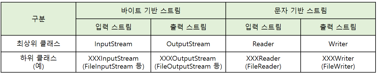 1) 바이트(byte) 기반 스트림 (1byte) : 그림, 멀티미디어 등의 바이너리 데이터를 읽고 출력할 때 사용