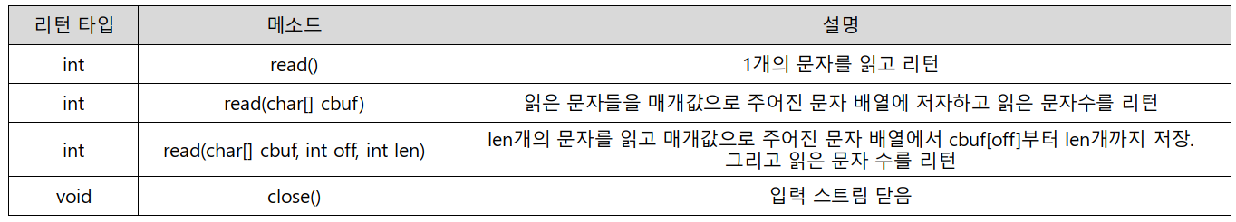 문자 기반 입력 스트림의 최상위 클래스로 모든 문자 기반 입력 스트림은 Reader 클래스의 상속을 받아 만들어진다.