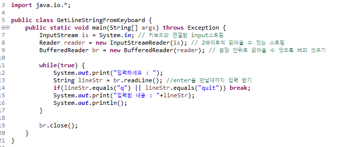 자바에서 제공하는 System 클래스의 in 정적 필드를 1바이트씩 읽어올 수 있는 InputStream 객체에 연결하고, 2바이트씩 읽어올 수 있는 Reader로 변환한 후 다시 BufferedReader를 연결한다. (7~9번째 줄) while문으로 들어가 readLine()로 인해 라인 단위, enter를 만날 때 까지 인력을 받아 lineStr에 저장하고 저장된 값이 q 또는 quit인지를 확인 후 아니라면 입력 받은 문자열을 출력한다.