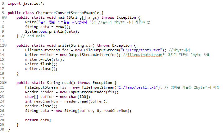 *소스 스트림이 바이트 기반 스트림이면서 입출력 데이터가 문자일 경우 Reader 와 Writer로 변환해서 사용하는 것이 편리함