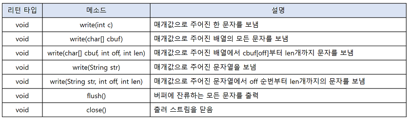 문자 기반 출력 스트림의 최상위 클래스로 모든 문자 기반 출력 스트림 클래스는 Writer 클래스를 상속받아 만들어진다.