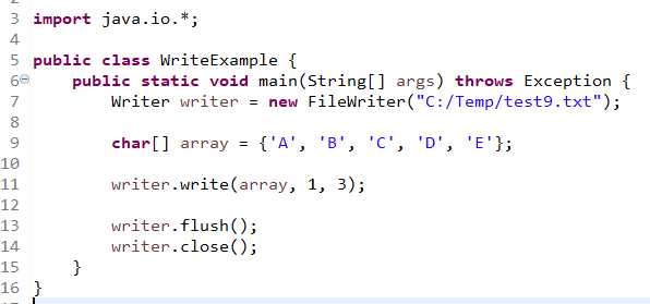 7번째 줄과 같이 파일과 연결된 FileWriter 객체를 생성하고 객체의 주소를 레퍼런스 변수 writer에 대입한다. 9번째 줄과 같이 char 타입의 배열을 생성해준 후 11번째 줄과 같이 write() 메소드를 사용해 배열을 출력한다. 이때 첫 번째 인자값은 배열의 주소를 담고 있고 두 번째 인자값은 출력할 배열의 인덱스, 세 번째 인자값은 두 번째 인자값으로 부터 몇 개를 출력할 것인지의 의미를 가지고 있다. 결과적으로 연결된 파일에 B, C, D가 출력된다.