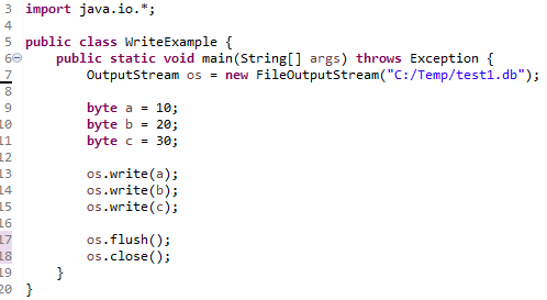 7번째 줄과 같이 new 연산자를 사용해 FileOutputStream 생성자를 호출하여 "C://Temp/test1.db"와 연결된 스트림 객체를 만들어준다. 이 경우 프로그램과 해당 파일을 순회하는 스트림 객체가 만들어져 참조변수 os를 이용해 사용할 수 있다. 그 후 13~15번째 줄처럼 write() 메소드에 값이 저장된 변수 a, b, c를 인자로 주어 연결된 파일에 값을 출력한다. 그 후 출력 버퍼에 잔류하는 모든 바이트를 출력하는 flush() 메소드를 호출하고, 마지막으로 close() 메소드를 호출하여 출력 스트림을 닫는다.