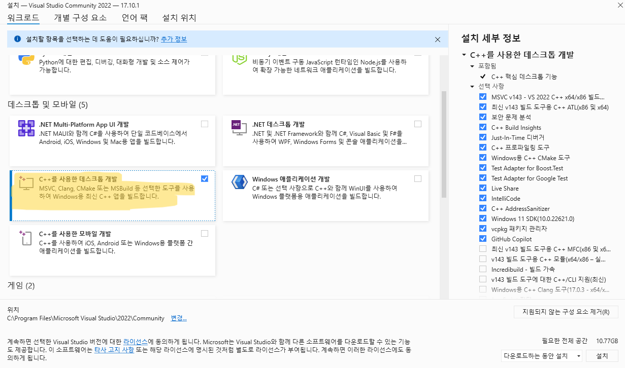 visual studio가 실행되는 화면에서 C++를 사용한 데스크톱 개발 체크 후 설치를 진행합니다.