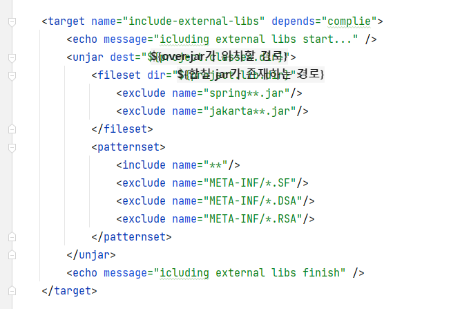 <fileset>의 <exclude>를 사용해서 특정 jar 파일을 제외하고! 제외한 파일들 중에서 <patternset>을 사용해서 META-INF 디렉터리 내의 특정 파일들을 제거한다는 뜻입니다.