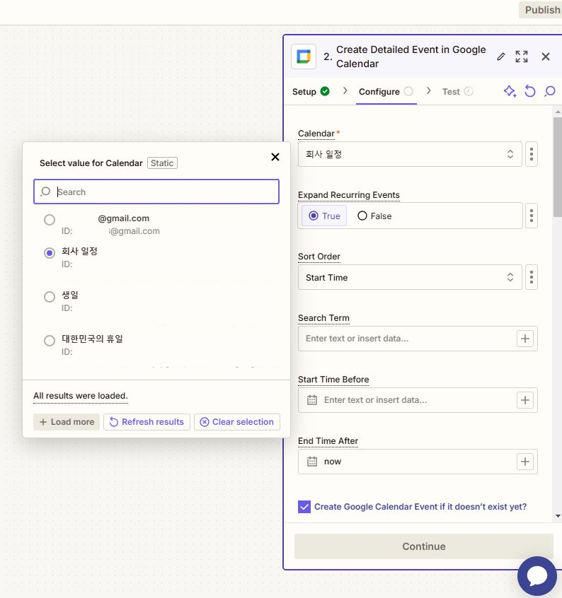 Test 단계로 넘어와서 Find new records를 누르게 되면 앞에서 선택한 데이터베이스에 최근에 추가한 아이템 목록이 나오게 됩니다. 만약 여러 개여서 어떤 내용을 테스트에 사용할지 모르겠다면 > 모양을 눌러서 데이터를 확인해 주세요. 선택을 완료했다면 Continue... 버튼을 눌러서 이제는 구글 캘린더 설정으로 넘어가 보겠습니다.