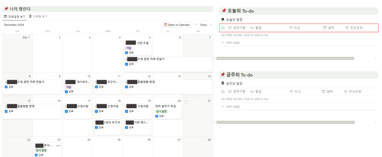 2024년 12월 프로젝트의 준공일 다가오면서 서류 작업(사용자 사용 설명서, SW 설치서 등)과 개발(수정 사항)을 하게 되었고 바빠지다 보니 개인 일정과 겹치는 일이 발생했습니다. 노션의 경우 출근해서 확인하는 습관이 잘 들어있던 반면 캘린더는.. 알람이 울리면 그때 확인하는 습관이었어서.. 서류 마감이 금요일인데 저녁 약속도 금요일이었던 거죠..! 다행히 회사 일정을 마감 기한을 꽉 채워서 일을 하는 스타일이 아니라서 두 일정 모두 지장이 없긴 했습니다:D 그래도 이때를 계기로 일정 관리에 대해 다시 생각해 보는 시간을 가지게 되었다는 걸 설명하고 싶었습니다..!