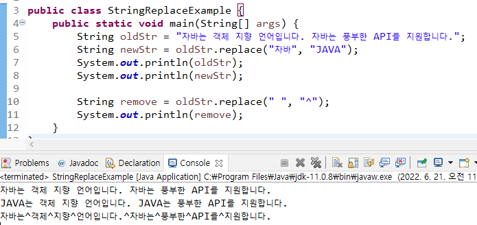 첫 번째 매개값인 문자열을 찾아 두 번째 매개값인 문자열로 대치하여 새로운 문자열을 생성하고 리턴한다.