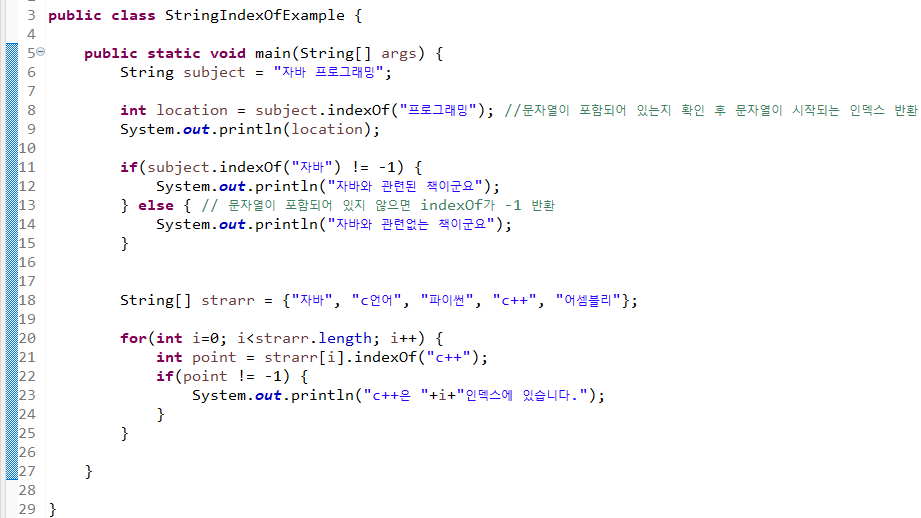 매개값으로 주어진 문자열이 시작되는 인덱스를 리턴하며 문자열이 포함되어 있지 않으면 -1을 리턴한다.