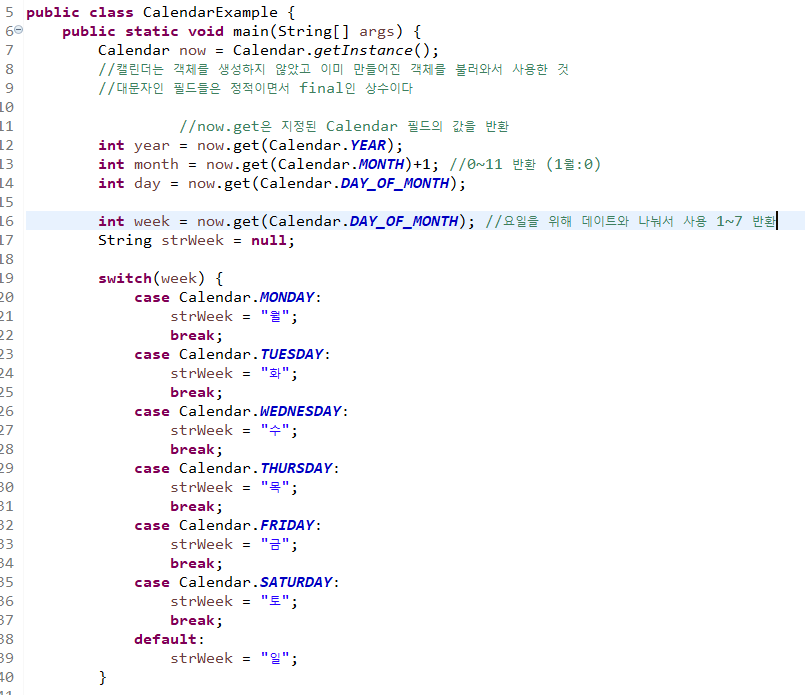 달력을 표현한 클래스이다. Calendar 클래스는 추상 클래스(싱글톤 객체임)로 new 연산자를 사용해서 인스턴스를 생성할 수 없기 때문에 다음과 같은 방법으로 현재 os에 설정되어 있는 시간대를 기준으로 Calendar 하위 객체를 얻을 수 있다.
